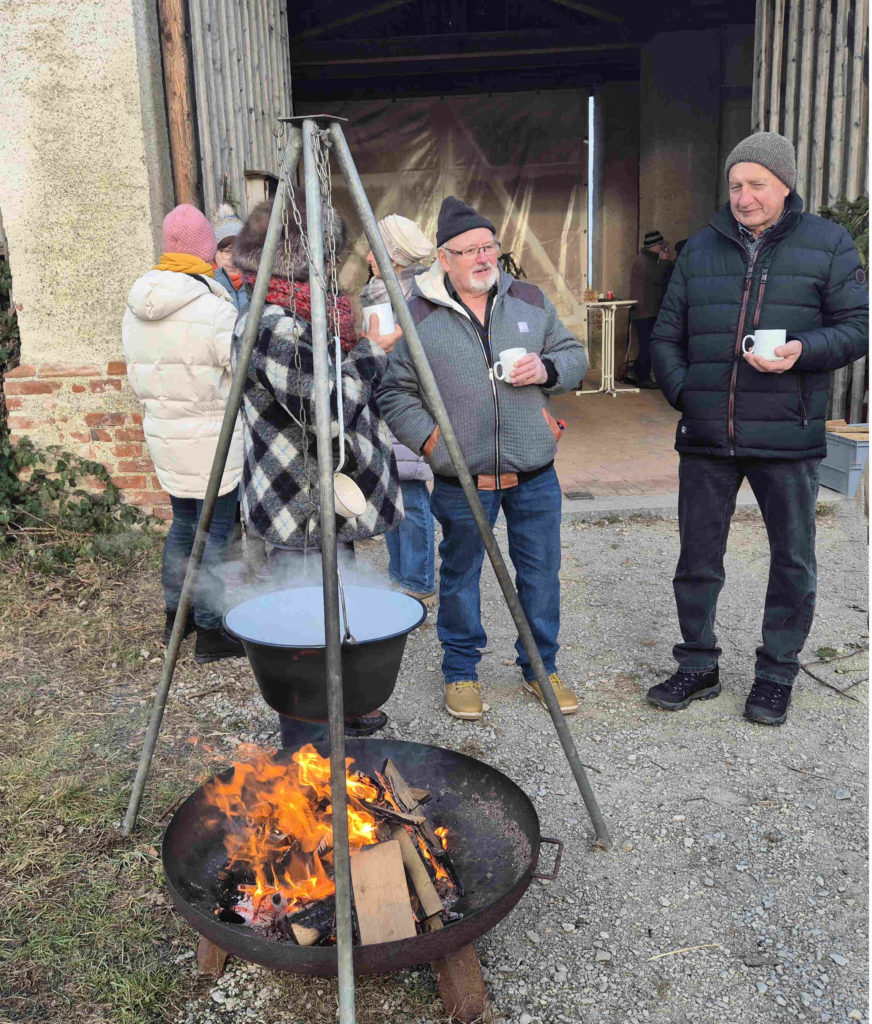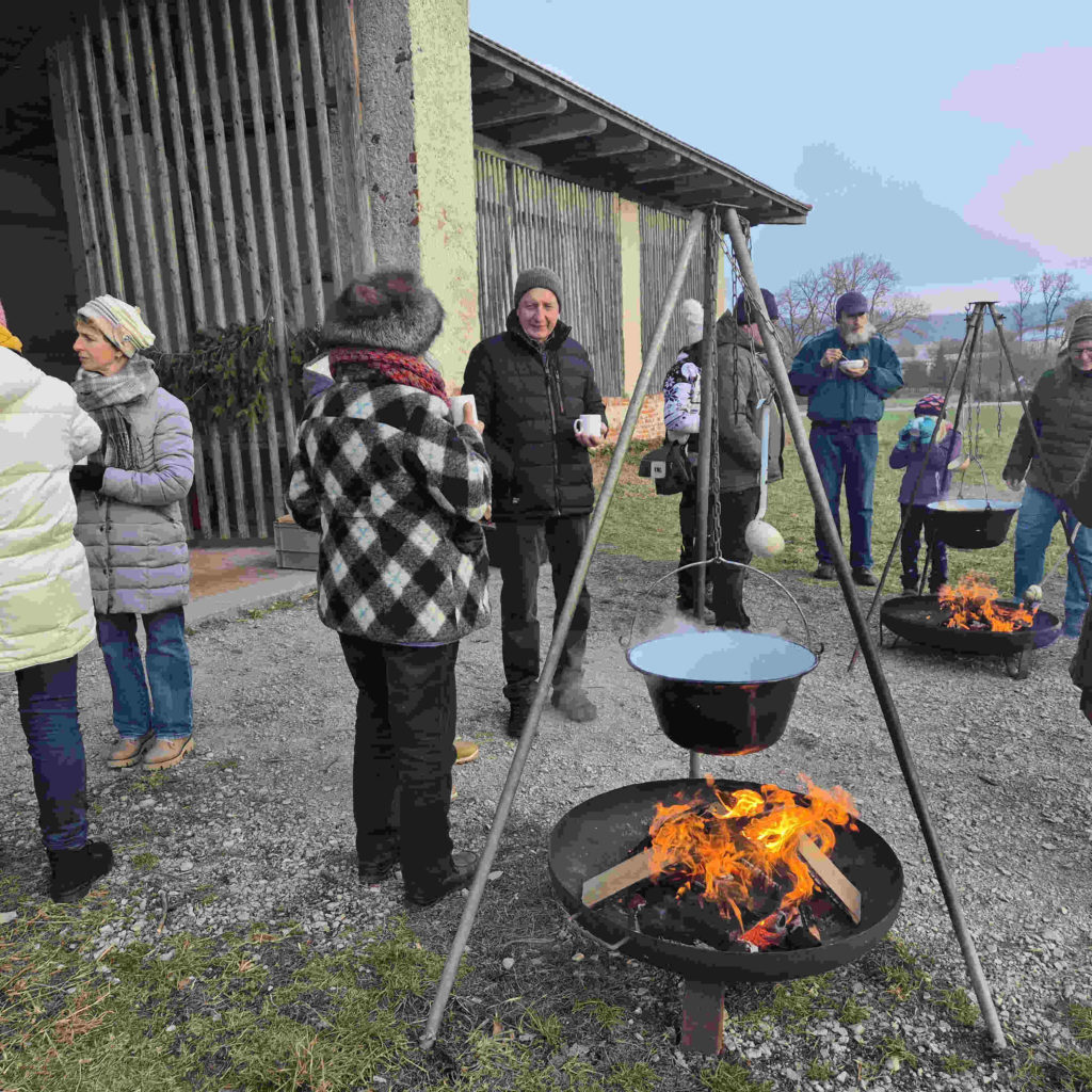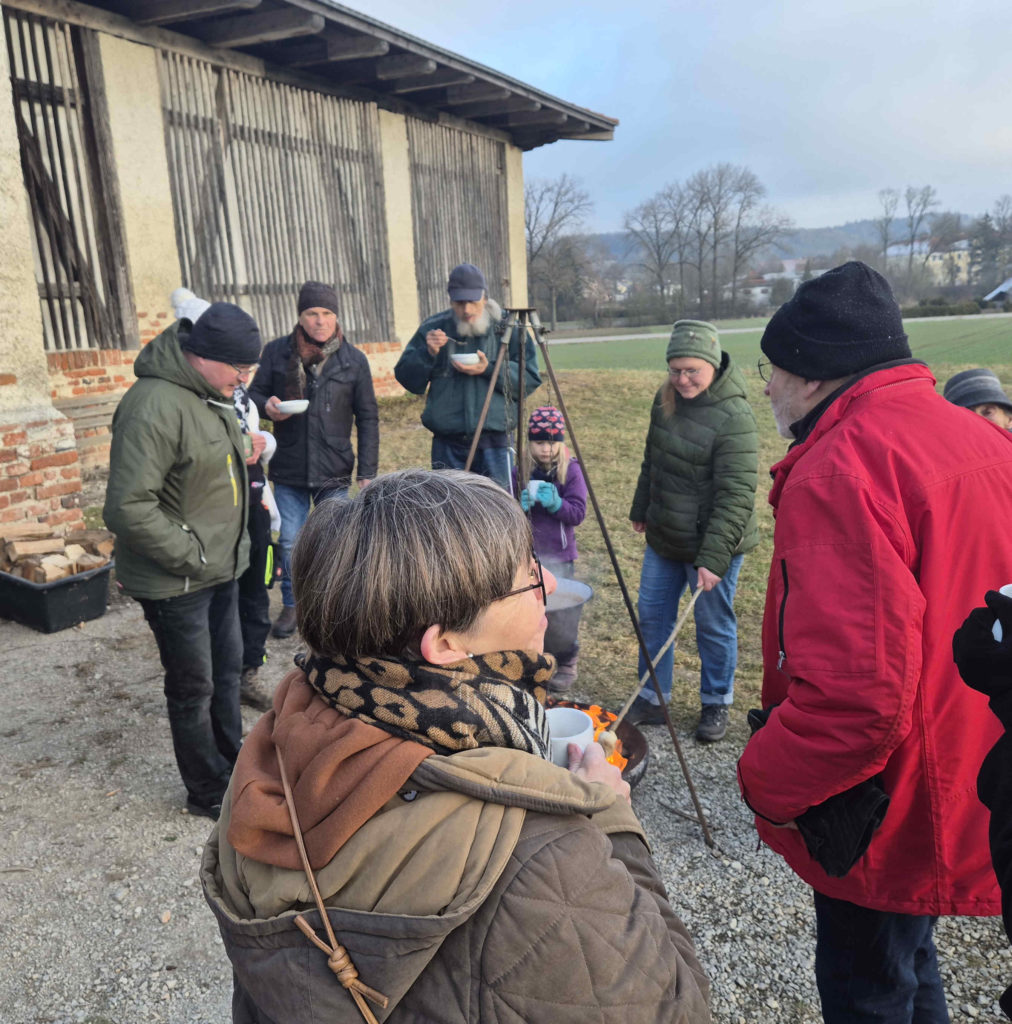 Gerade recht kam es den teilnehmenden Vereinsmitgliedern nach den Weihnachtstagen gemeinsam ein paar Schritte in der klaren, kalten Winterluft zu laufen. Die Landschaft zeigte sich von Frost und ein paar Schneeflocken wie überzuckert und die kurze Wanderung von Rottenburg nach Niederhatzkofen zum Repstadl war auch für jene gewählt, die nicht so gut zu Fuß sind. Schon von weitem konnte man die dampfenden Kessel und Roman Heiß, der die Vorbereitungen getroffen hatte, vor dem imposanten Gebäude erkennen. Nach einer halben Stunde war das Ziel erreicht. Rund um das offene Feuer wärmte sich die Gruppe mit Apfel-Quitten-Punsch, einer wohlschmeckenden Gulaschsuppe und naschte als kleinen Gaumenschmaus Schokokuchen, um das nachmittägliche Mahl abzurunden. Zur Freude der Kinder wurde über der Glut Stockbrot gebacken. In gelöster Stimmung und mit netten Gesprächen fand so das Jahr für unseren Verein mit diesem letzten Treffen einen gelungenen Abschluss.