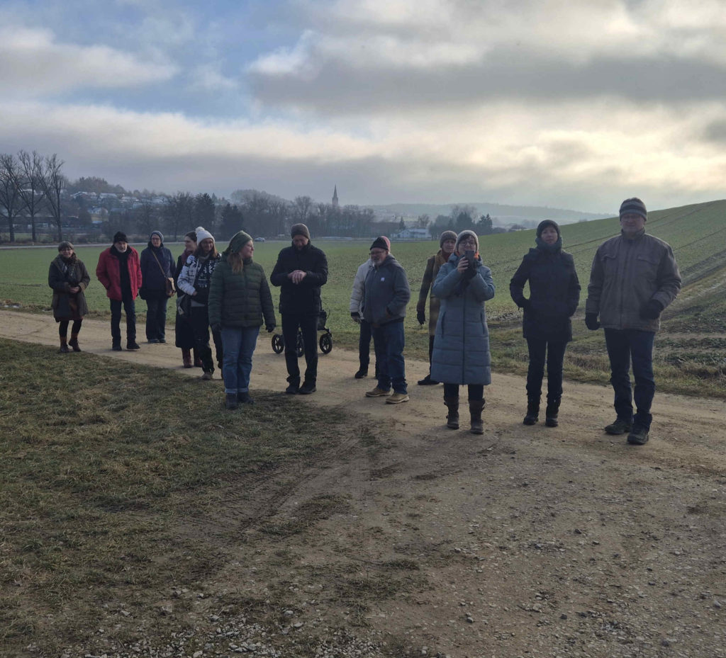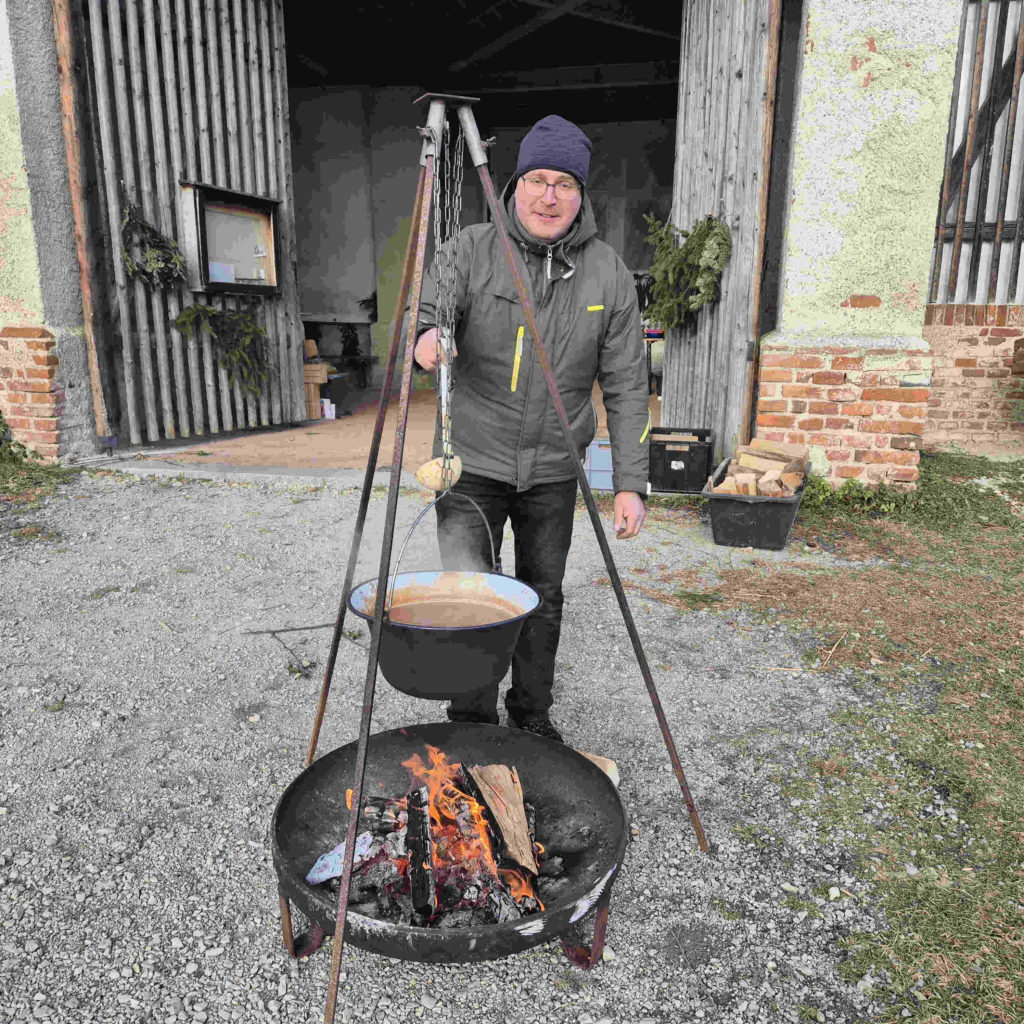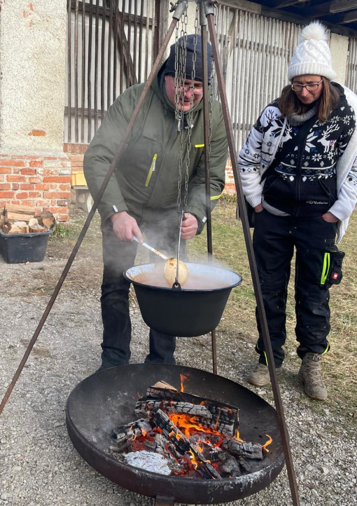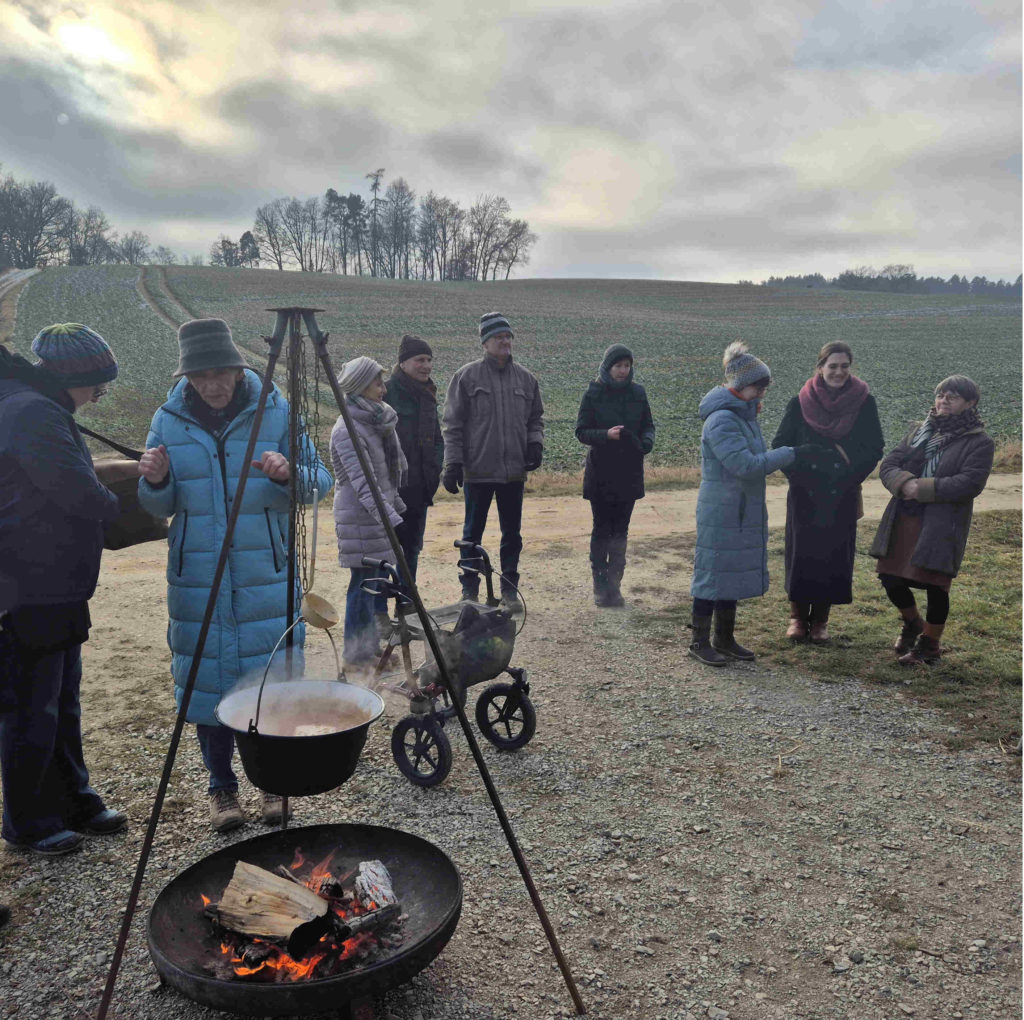 Gerade recht kam es den teilnehmenden Vereinsmitgliedern nach den Weihnachtstagen gemeinsam ein paar Schritte in der klaren, kalten Winterluft zu laufen. Die Landschaft zeigte sich von Frost und ein paar Schneeflocken wie überzuckert und die kurze Wanderung von Rottenburg nach Niederhatzkofen zum Repstadl war auch für jene gewählt, die nicht so gut zu Fuß sind. Schon von weitem konnte man die dampfenden Kessel und Roman Heiß, der die Vorbereitungen getroffen hatte, vor dem imposanten Gebäude erkennen. Nach einer halben Stunde war das Ziel erreicht. Rund um das offene Feuer wärmte sich die Gruppe mit Apfel-Quitten-Punsch, einer wohlschmeckenden Gulaschsuppe und naschte als kleinen Gaumenschmaus Schokokuchen, um das nachmittägliche Mahl abzurunden. Zur Freude der Kinder wurde über der Glut Stockbrot gebacken. In gelöster Stimmung und mit netten Gesprächen fand so das Jahr für unseren Verein mit diesem letzten Treffen einen gelungenen Abschluss.