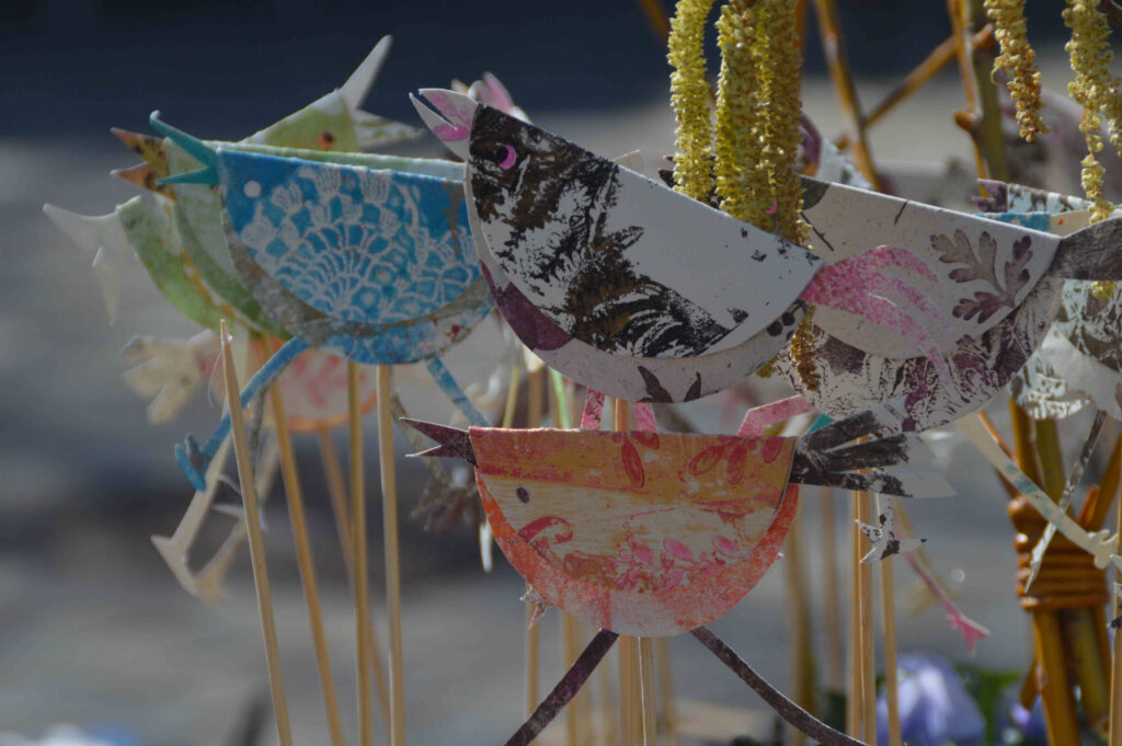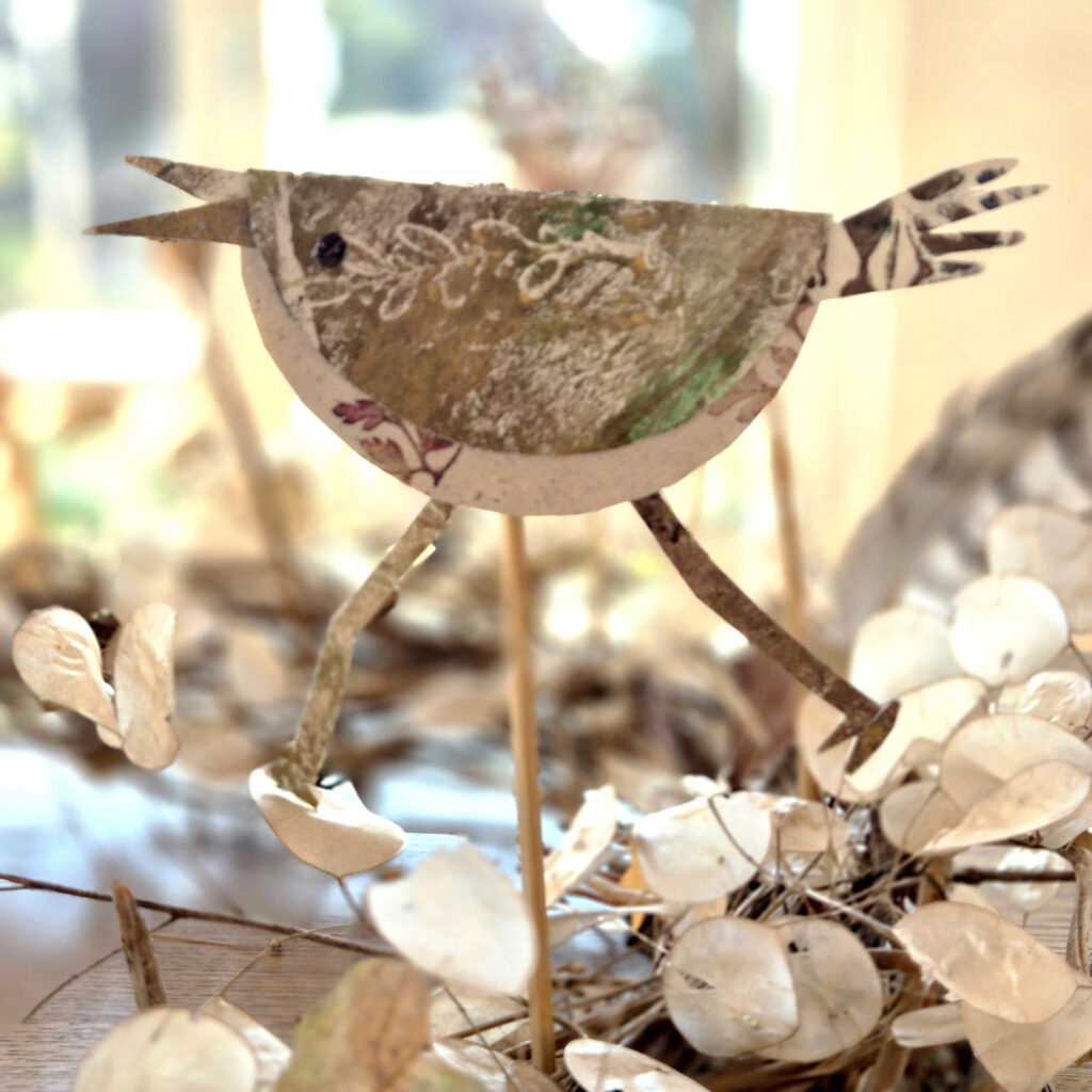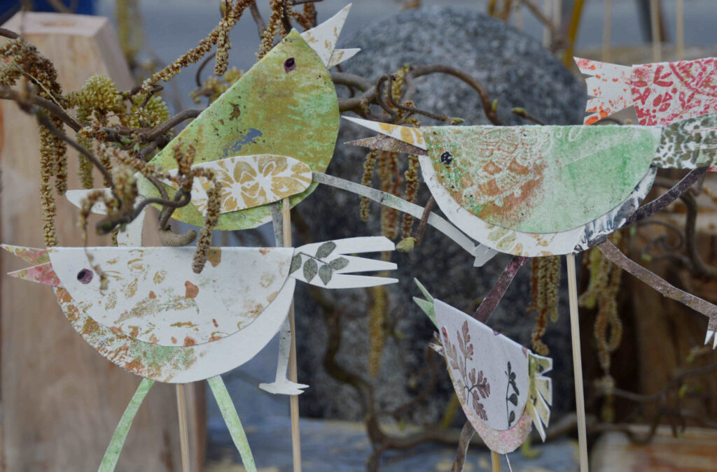 Bunte Vogelschar: statt buntem Federkleid handbedrucktes Papier