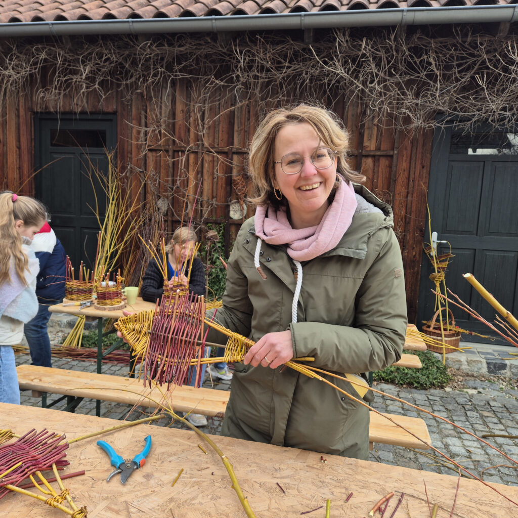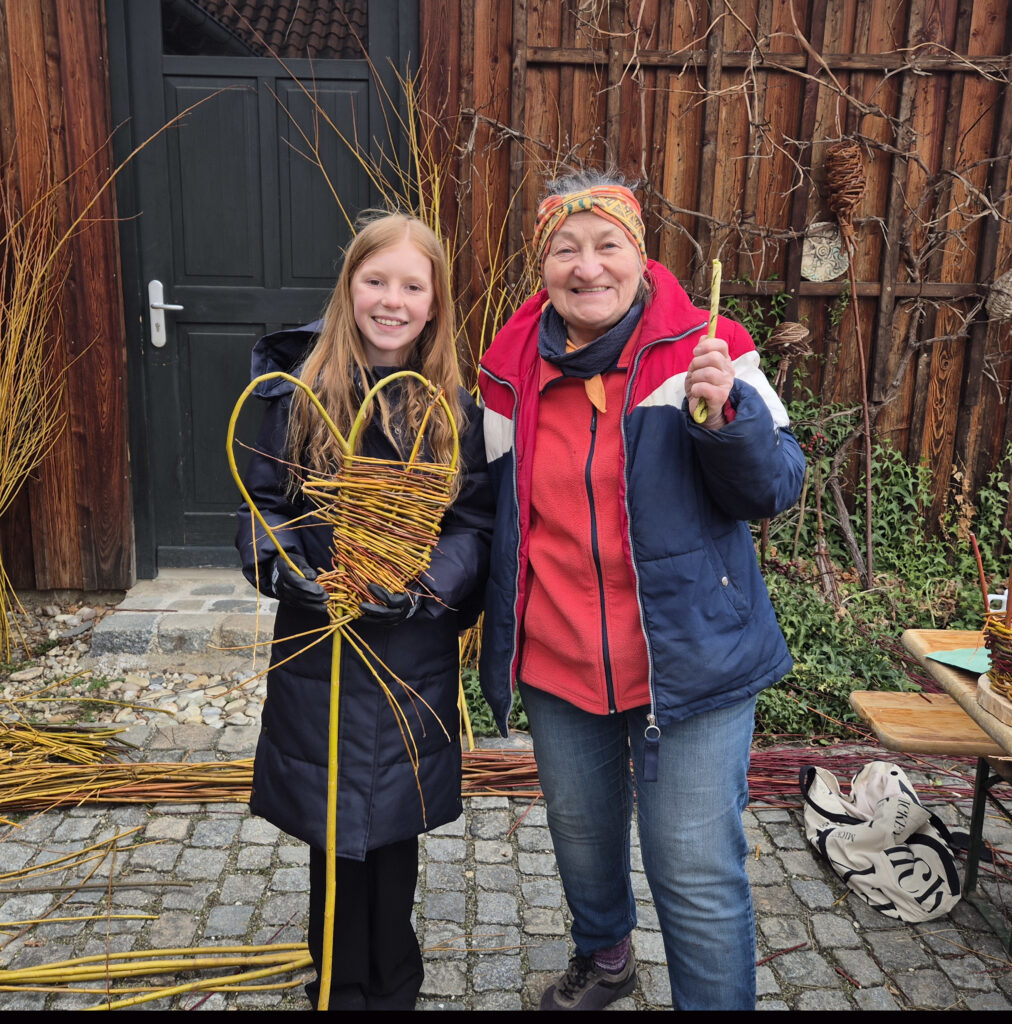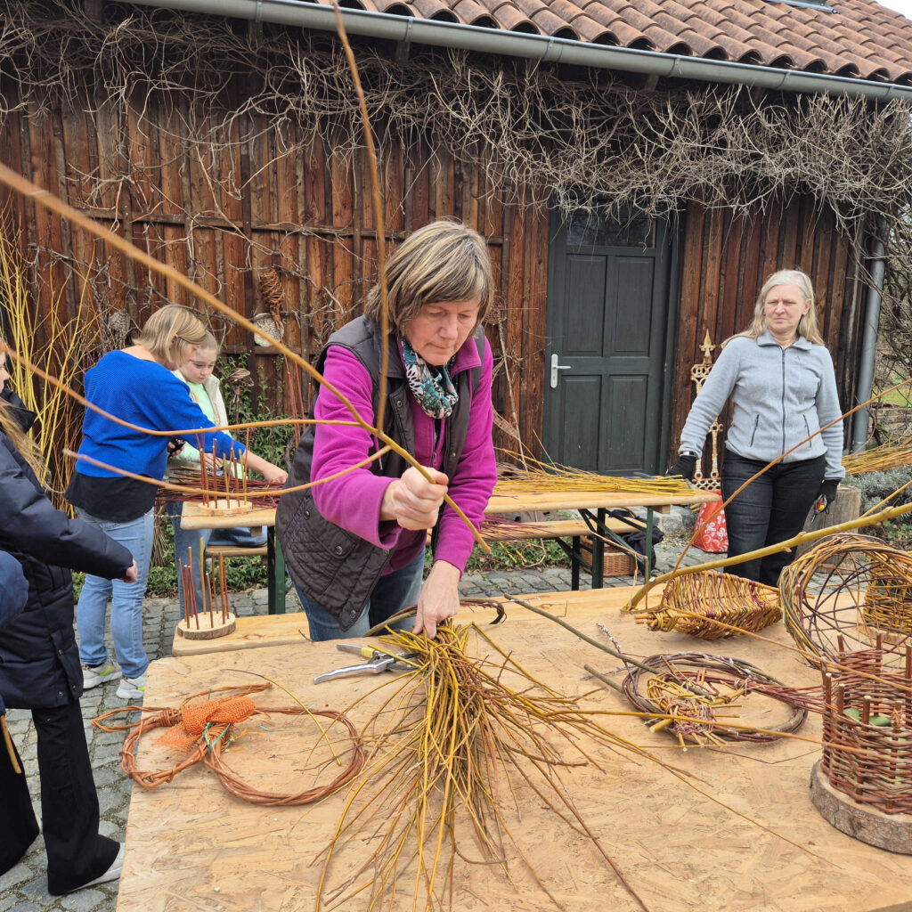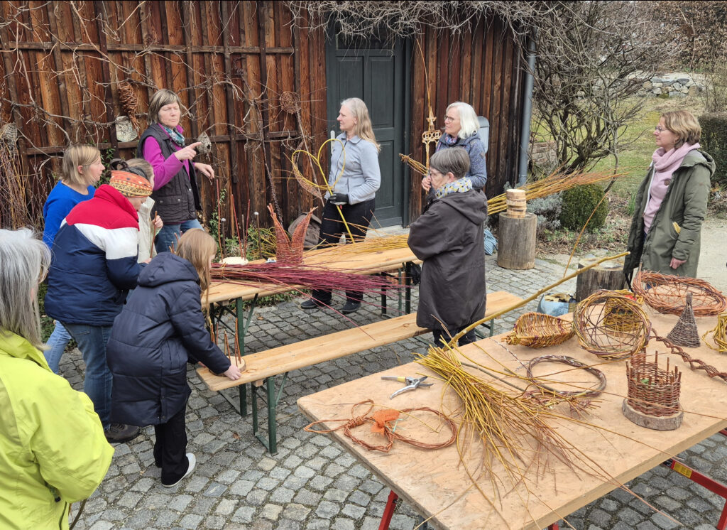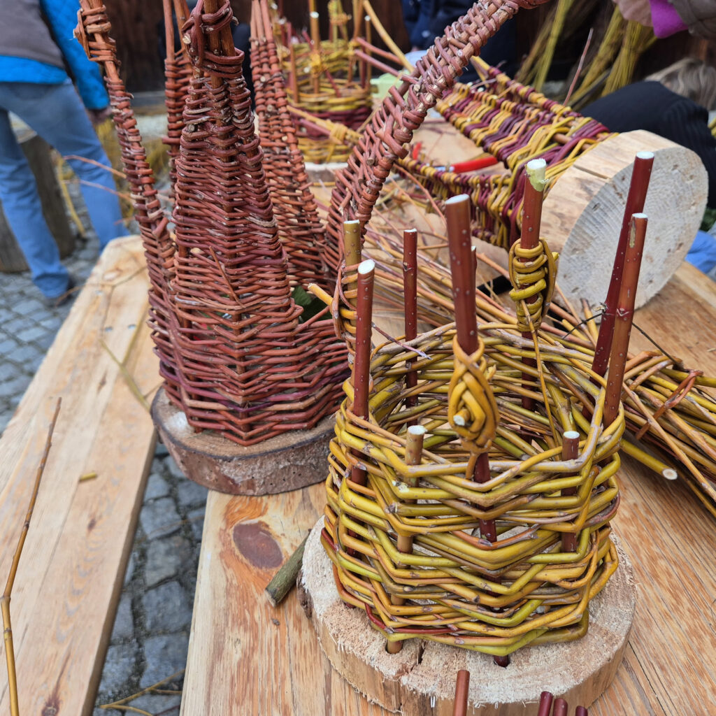 Das anfallende Schnittgut mit den enorm biegsamen Ruten der Korb- und Silberweide, sowie des Hartriegels diente uns wiederum als ideales, farbenfrohes Material und Grundlage für ein fast vergessenes Handwerk. Es inspirierte uns, Weidenherzen vorzubereiten, die dann während des Marktes an die Besucher verschenkt wurden. Groß und Klein durften sich an diesem Nachmittag in der Kunst des Weidenflechtens üben. Mit Feuereifer und viel Geschick flochten die Kinder ihre Körbchen, während von den Erwachsenen Weidensonnen gewunden wurden. Das Interesse war groß und freudestrahlend trug man die angefertigten Kunstwerke nach Hause.