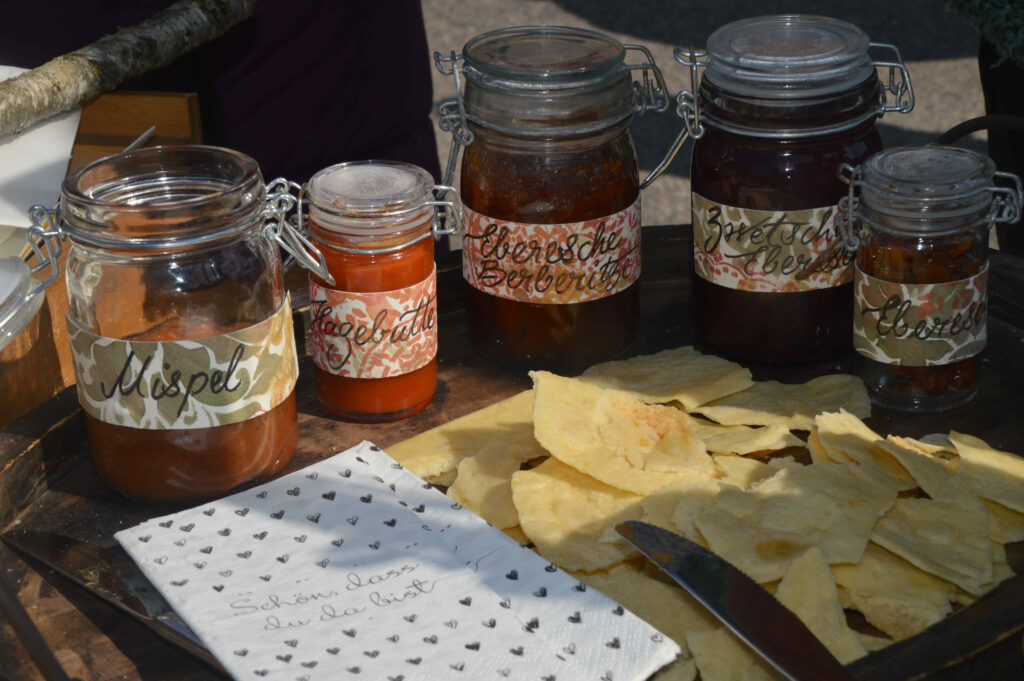 Unser Gartenbauverein stellte Stecklinge von Wildgehölzen vor, deren Früchte als Vogelnährgehölze für ein breites Futterangebot sorgen können und ganz nebenbei auch für den Menschen als Grundlage vitaminreicher, schmackhafter Aufstriche und Leckereien dient. Vor Ort konnten sich die Besucher gleich selbst eine kleine Kostprobe einverleiben: das Mus von Ebereschen, Berberitzen, Mispeln und Hagebutten. Zu einer vielfältigen Wildobsthecke gehören u. a. auch Holunder, Weißdorn und die Felsenbirne.